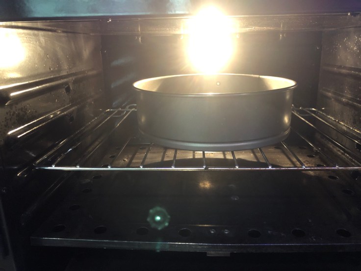 I place the cake pan with mix on the second level from bottom. And set the timer for the lowest time listed for “two 9″ rounds”.