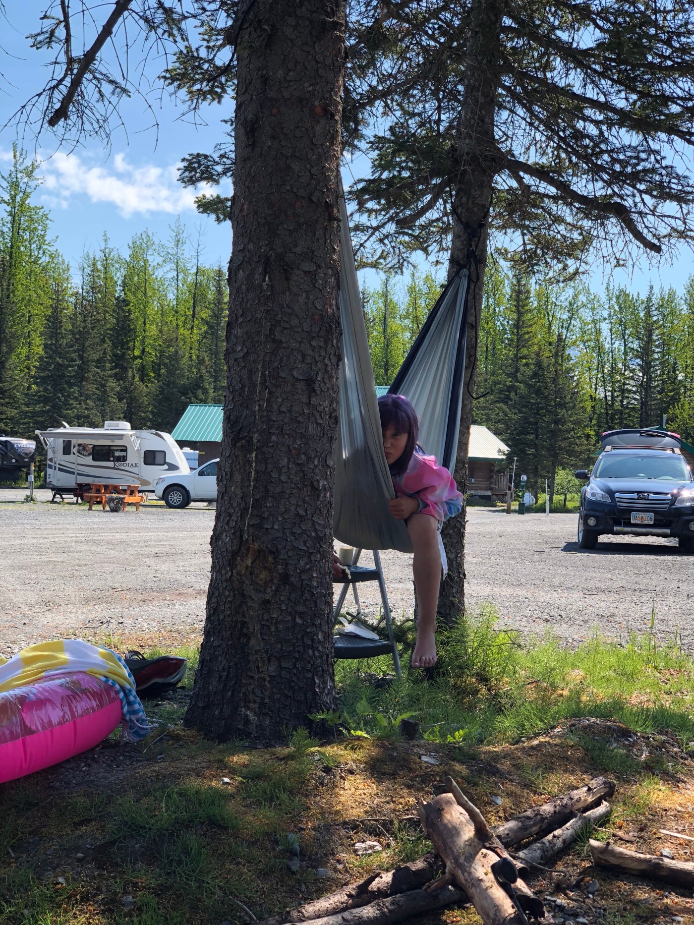 We also got Addy’s hammock put up in the trees just outside the camper. Apparently I didn’t do a very good job checking the knots that were already tied in the lines, because not 15 minutes into her horsing around, it fell out of the tree. She’s pretty happy now however, pretending she can’t touch the ground which means everything she wants she gets someone else to get for her.