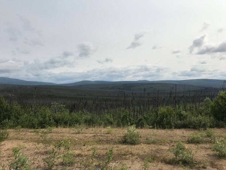 The landscape changed from the sharp peaks of the Alaska wilderness to rolling mountains and valleys. Forrest fire has destroyed much of the forest in this area and it will be a long recovery period before the spruce trees return.