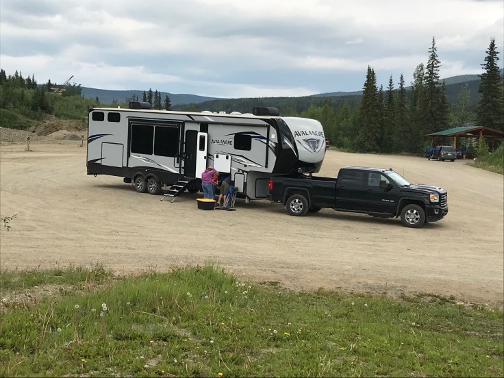 This turned into the longest 100 or so miles I think I have ever driven. Unpaved road for the first 90 miles, pot holes, washboard, ditches, narrow and no shoulder. As we were driving 35 most of the way to try and not tear the camper completely to pieces everyone else seemed intent on doing 65 mph at us and passing us. They must have just been excited to be moving to Canada too!