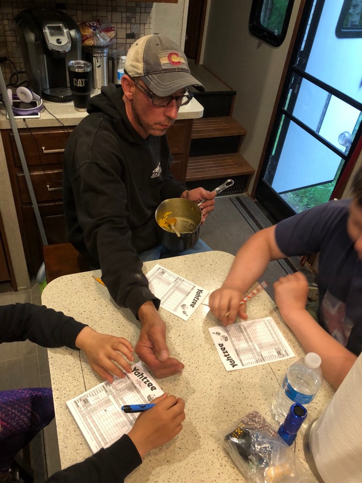 No power and no water but there is always Yahtzee! I whooped up on everyone to make up for the pancake tossing fiasco. And yes that is me eating out of a pot!